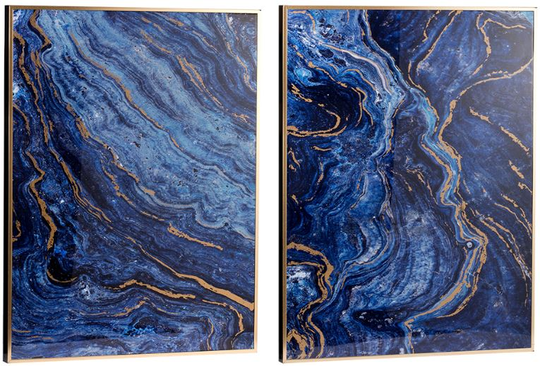 Boasting a combination of deep ocean blue and swirling gold hues in a marbled pattern, each panel print features a rectangular silhouette and an elegant gold frame. They will add a bold pop of color to any wall in your home or office whether they are displayed together or separated.Read More