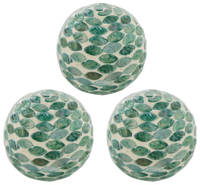 Finish off a tablescape with style with this set of 3 decorative cape balls. Each green sphere shines verdantly with the sheen of genuine capiz shell and ceramic. Nestle them all together in a large bowl on the dining table or among candles to create a natural, bohemian centerpiece.Read More