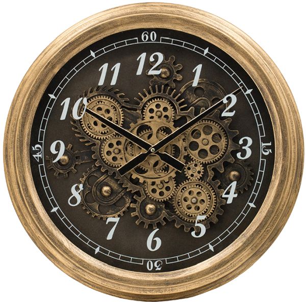 Give a room some antique flair with this round gear clock with a gold frame. The clock features an antique black finish and exposed gears. Place this clock on your wall to tell time and make a stylish statement.