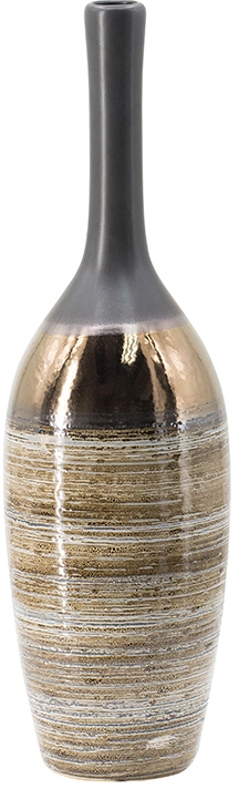 Earth tones are given modern texture in the effortless look of this bottleneck vase. A swirly pattern in neutral tones is complemented by a brass band. Its versatile shape, brown and copper finish, and appealing contemporary look make this vase a classic addition to any surface.