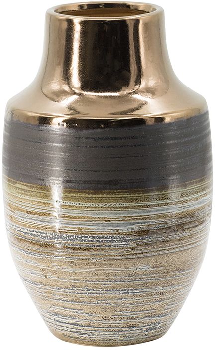 Earth tones are given modern texture in the effortless look of this urn vase. A swirly pattern in neutral tones is complemented by a brass band. Its versatile shape, brown and copper finish, and appealing contemporary look make this vase a classic addition to any surface.Read More