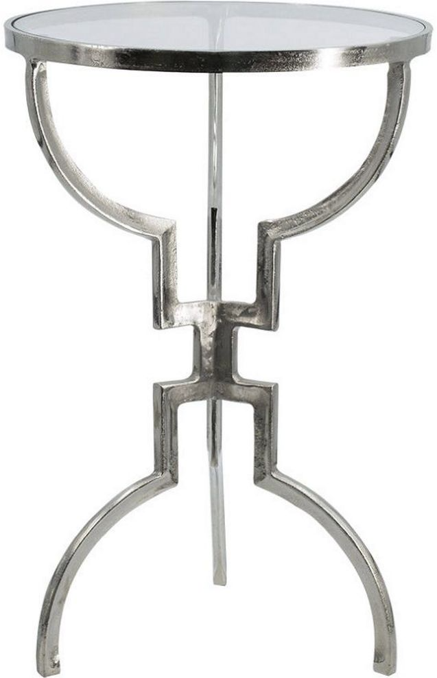 Shaped like an hourglass with a nickel finish, this accent table is made of aluminum and has a glass top. Its metal construction invites a glamorous inspiration to this piece, which is best for transitional décor. Flank a living room couch with this addition to highlighting mementos and other knick-knacks.Read More