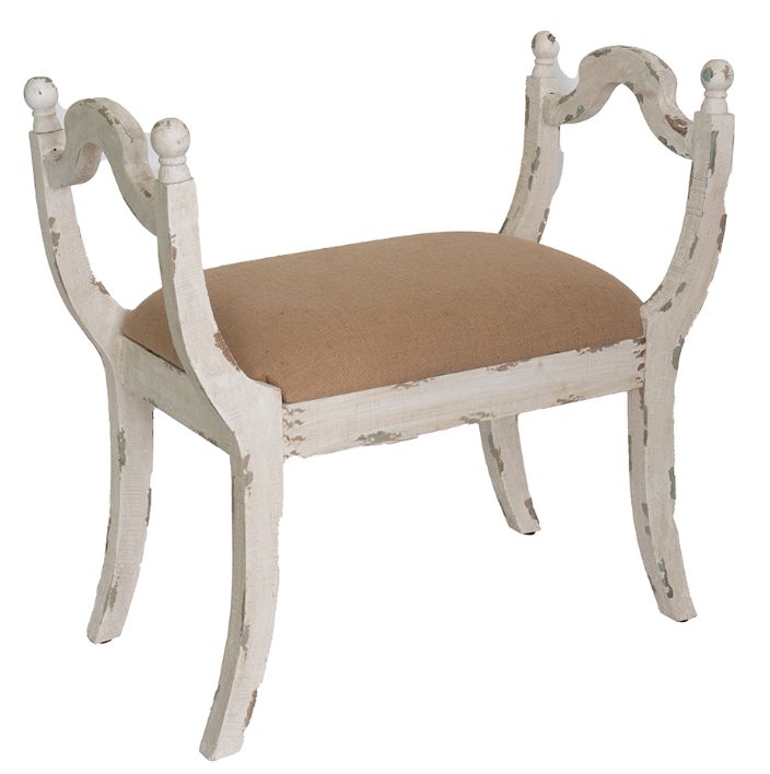 Add an element of vintage charm to your foyer, living room or bedroom with the Harlow bench. It can also serve as a decorative vanity chair. Featuring a slightly curved frame and rustic burlap upholstery, it is finished with white paint and distressed details.Read More