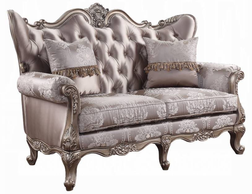 The Jayceon loveseat is gorgeous, with shimmery fabric upholstery that highlights the champagne finish of the wooden frame. Button-tufted seatbacks wing out under carved arches. Loose seat cushions are upholstered in a floral patterned fabric that extends over rolled arms. A scrolled floral motif adorns each piece in this addition to Acme's exclusive design collection.Read More