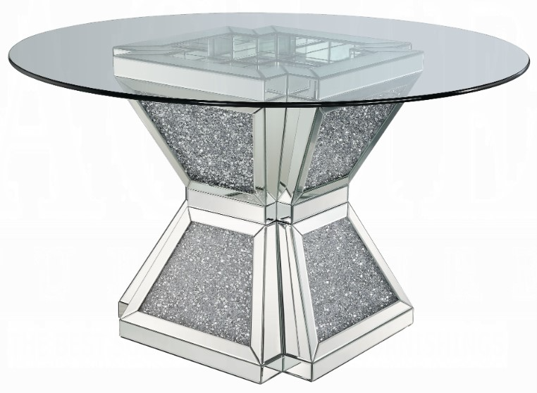 Build a sense of space and style room with hourglass pedestal with glass tabletop. The dining table sits atop a hourglass-style pedestal that features geometric lines and faux diamonds inlay for a striking silhouette.Read More