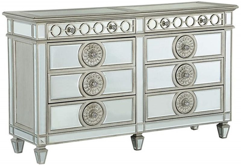 The Varian dresser provides a commanding presence in any room. Add a dash of glam to your bedroom with this Varian dresser, this dresser features four tapered legs and 8 storage drawers with crystal-like knobs. This gorgeous dresser is accented with raised geometric patterns and mirror finish.Read More
