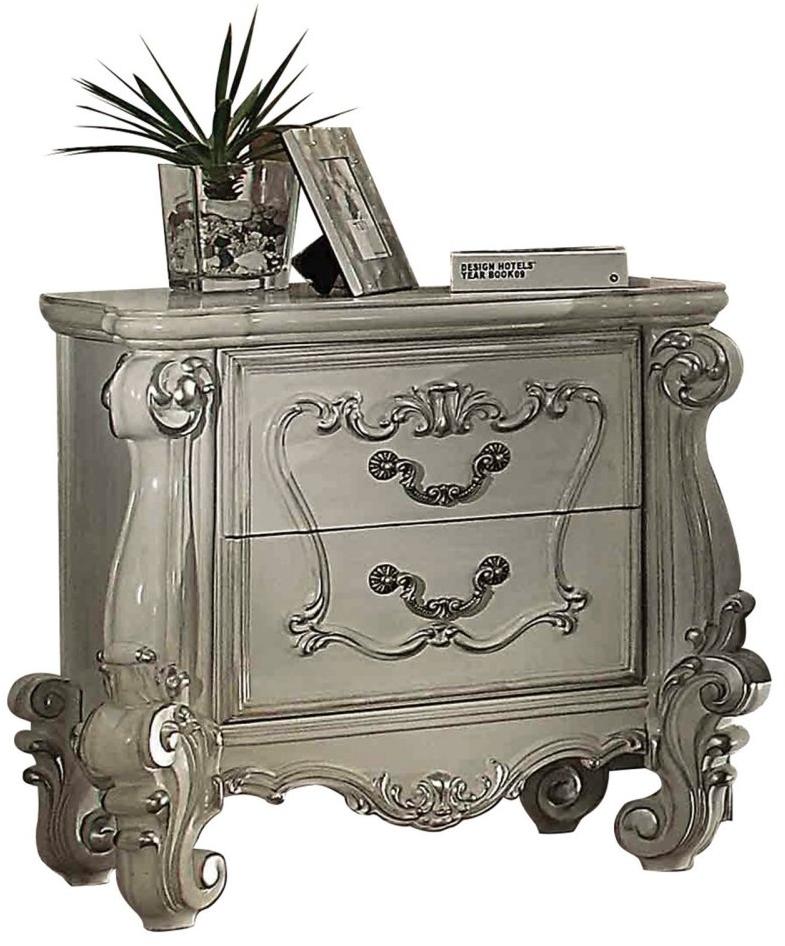 The Versailles nightstand is the perfect accent to create the style of royalty your bedroom has been needing. This nightstand crafted in wood with bone white finish was inspired by old European design with brown copper metal hardware and intricate wood carvings on the front of the two drawers.Read More