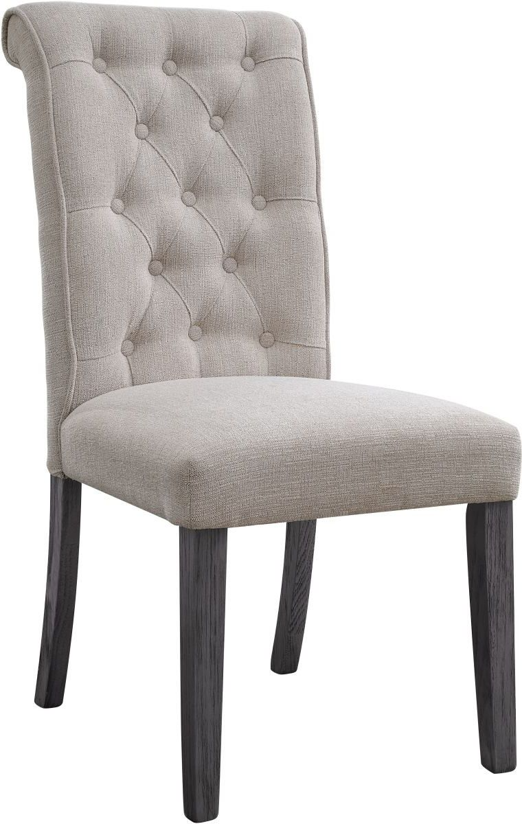 Beige linen upholstery fully covers its wooden frame for a light and airy feel. The side chair boasts a rolled back design with tufted button details, which embodies a timeless look with a classic flair. Wooden legs in a muted gray finish lend a bit of natural charm.Read More