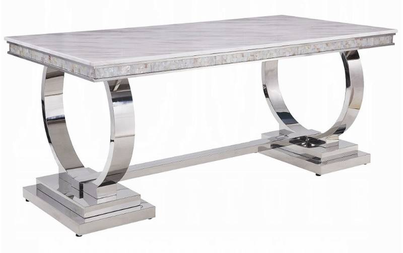 Get your dining guests instantly intrigued by the eye-catching and modern design. Open circle-accented trestle base made of shiny stainless steel is topped with beautiful cultured marble. It's metal frame showcases uncluttered lines and simplicity of this style, with mirrored silver finish emitting a luxurious glitter.Read More