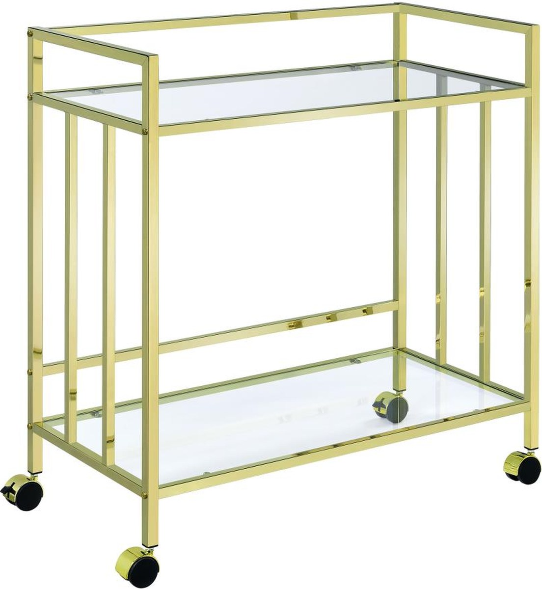 Welcome guests and serve up libations with this sleek contemporary bar cart. A rectangular silhouette outlined in a slim, square metal frame lends an Art Deco-inspired aesthetic to dining spaces and more. Two clear tempered glass shelves allow you to showcase your favorite bottles and barware.Read More