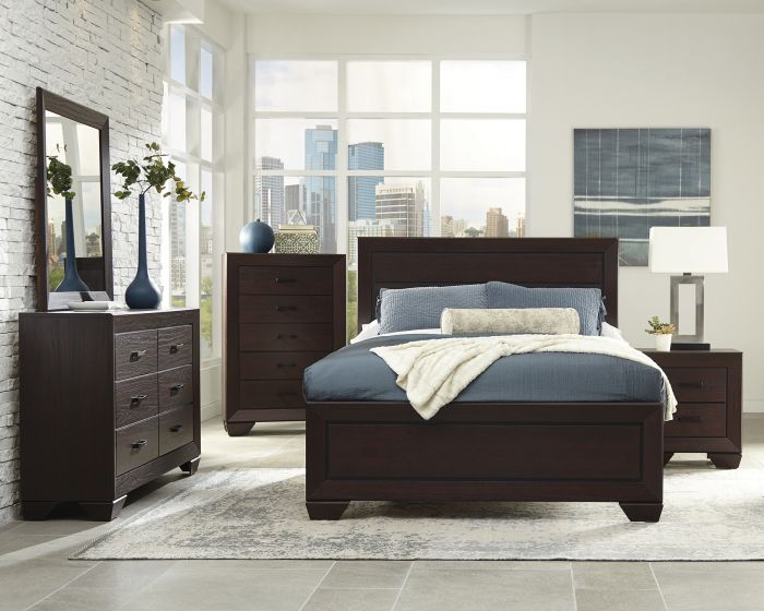 Feel refreshed every time you step into your bedroom with the Kauffman collection. The natural oak grain, tapered feet, recessed black grooves and picture-frame design meld rustic sentiments with contemporary flair. Coupled with storage options, this CoasterEveryday collection is exactly what you need for your ideal dream retreat.