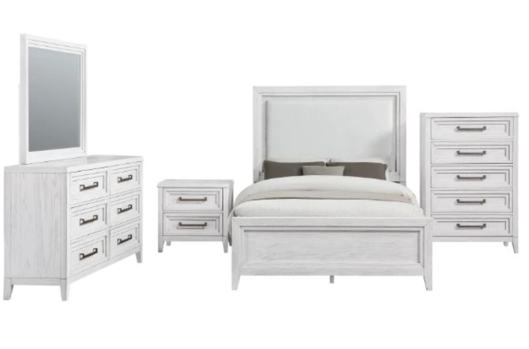 Includes: One (1) California king bed, one (1) nightstand, one (1) dresser, one (1) dresser mirror, and one (1) chest