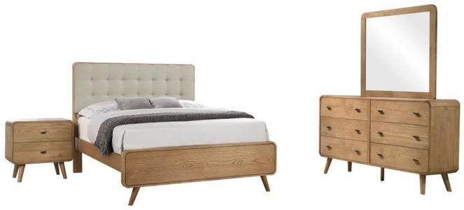 Transform your bedroom into the ultimate retreat with this mid-century modern bedroom set. Expertly crafted from rubberwood, engineered wood, and ash veneer, the set includes a bed, nightstand, dresser, mirror, and optional chest for a cohesive look. Rounded edges, tapered legs, and square tufting lend a retro-inspired flair.Read More