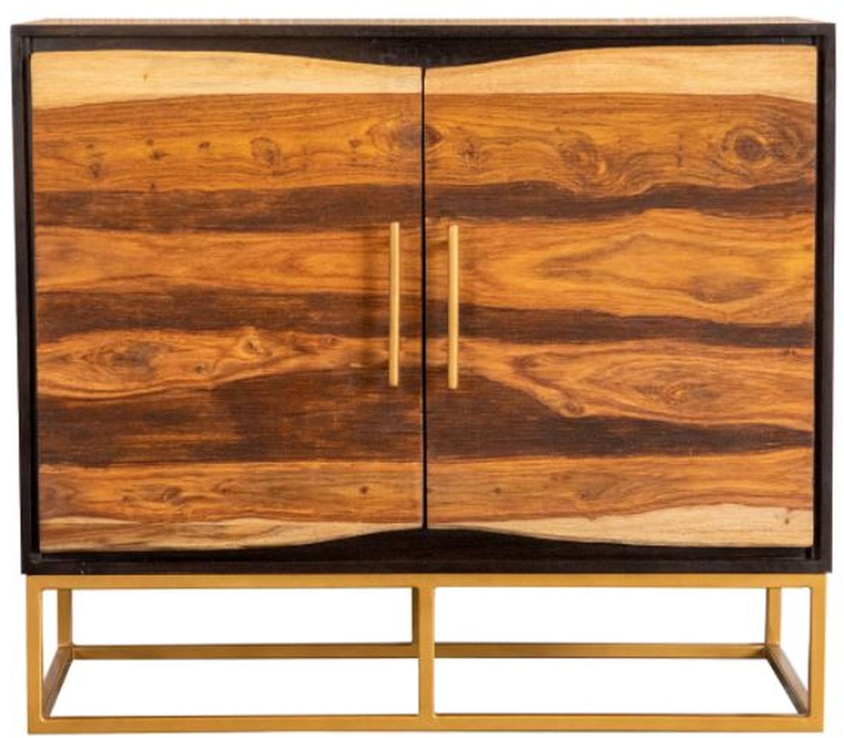 A handcrafted accent cabinet from India makes its presence known. With its mix of natural wood colors, it'll instantly captures attention in your living area. Gold hardware with a matching geometric base provides durability and aesthetic flair. Two large cabinet doors hold your valuables within. Neatly arrange your items on the single interior shelf.