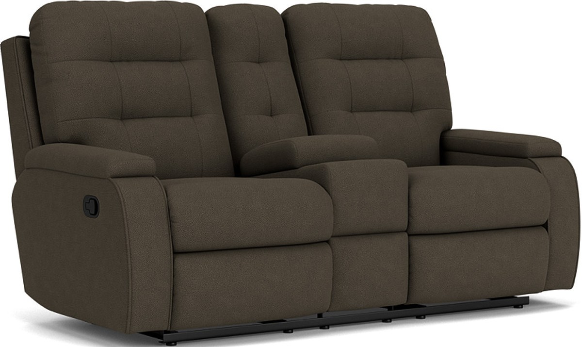 Share the indulgent comfort with the Kerrie fabric reclining console loveseat. With pillow-track arms and a Blue Steel Spring unit for support, you’re never too far from comfort. Center console provides storage for convenience.