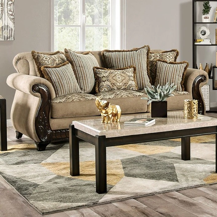 Ornately carved wood details highlight this unique mocha fabric-upholstered solid wood sofa that has been proudly made in the U.S.A. As an American product, you can count on its durability and longevity.Read More