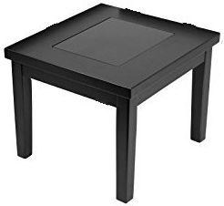 The Denja end table features a dark brown, hand-applied finish, inset black glass, and subtly tapered legs.