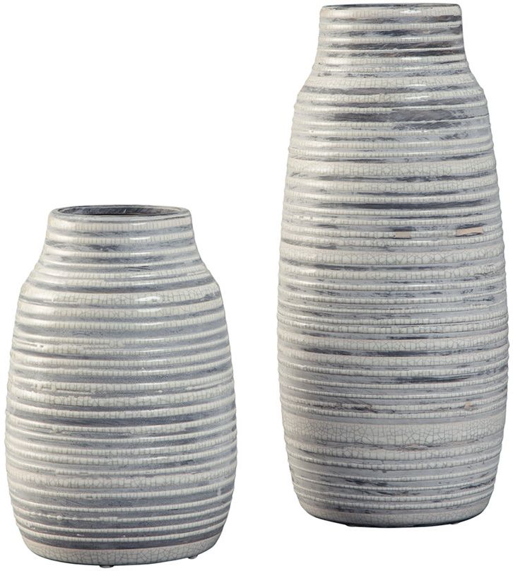 This duo of Donaver vases comes in 1 small and 1 large tapered vase with traditional-style ribbing in neutral tones of gray and white.