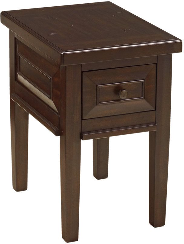 This Hindell Park side end table features a hand-applied, rustic brown finish, 1 dovetail drawer on ball bearings, and antiqued-brass tone hardware.
