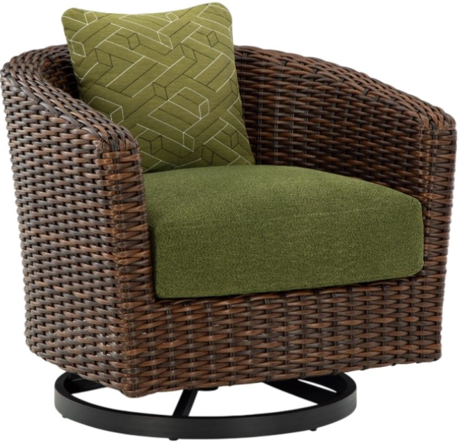 This outdoor swivel lounge chair recalls the aesthetics of nature to bring an inviting, high-style feel to your patio or lanai. Its Nuvella+™ performance fabric is made with enhanced UV resistance, so the chic green hue stays brighter for longer. Worried about the weather? Don't sweat it—the durable resin wicker withstands the elements from season to season.Read More