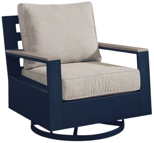 Easy-breezy beauty, made to withstand the elements. This outdoor swivel glider lounge chair makes a serene statement with its soothing shade of blue and contrasting wood-look arms. A cushioned seat and back keep you comfy as you lounge.Read More