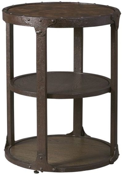 Shofern Round End Table made with textured metal with a dark umber color finish with a burnished glaze effect.Read More