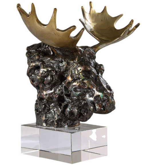 Introducing our exquisite Moose Bust, a majestic symbol of strength and elegance. Crafted in tarnished bronze with gleaming gold antlers, this stunning piece exudes timeless sophistication. Poised atop a shimmering crystal base, it commands attention and adds a touch of luxury to any space.Read More
